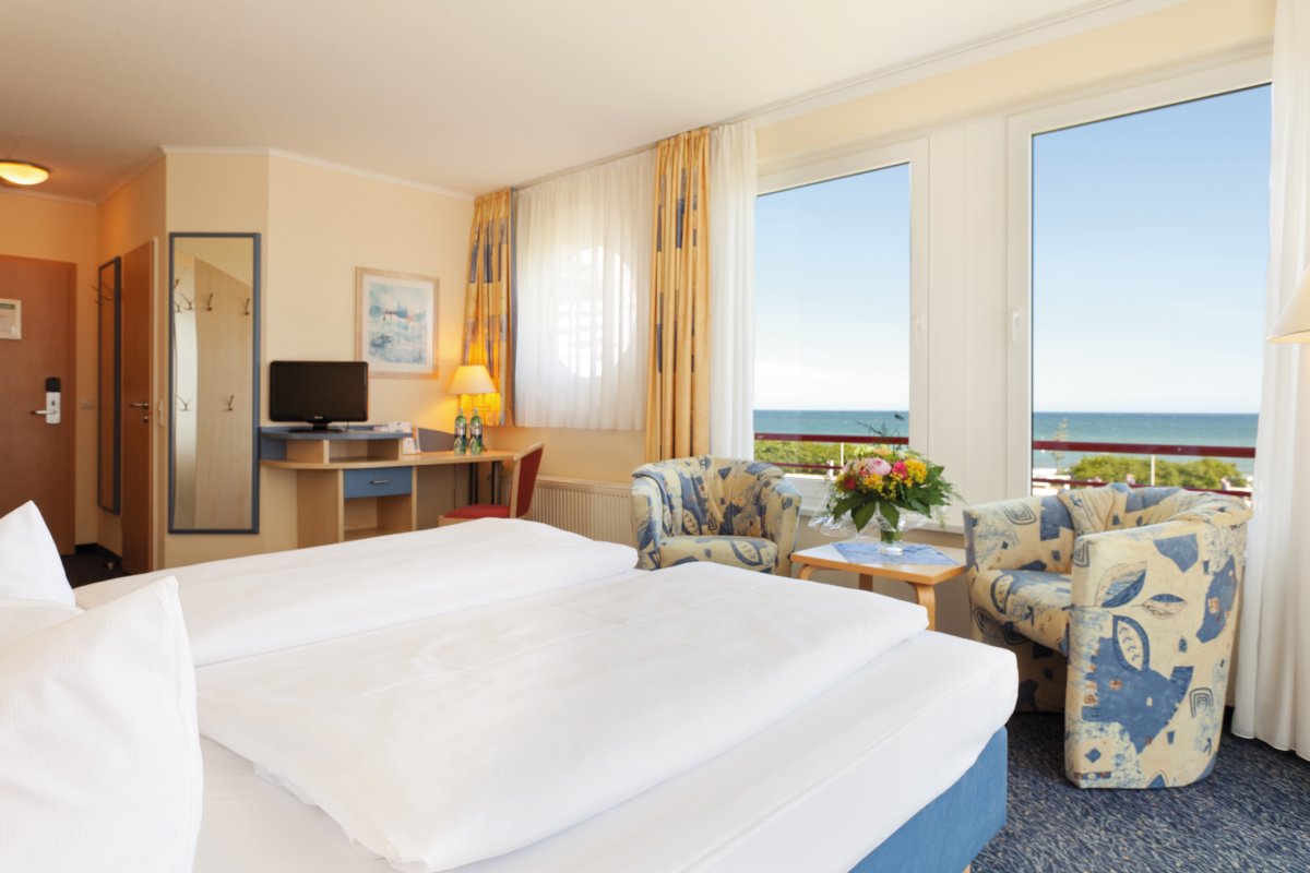 Sie wohnen im Morada Resort Kühlungsborn. Die komfortablen Zimmer bieten gediegene Wohnlichkeit. Alle Zimmer sind komfortabel ausgestattet mit DU/WC, TV, Telefon, Sitzecke, Fön und Safe. Zu den Annehmlichkeiten des Hauses zählen drei Restaurants, die Brasserie Bernstein mit Seeblick, das Cafe‘ Mermaidbar mit Panoramablick und das Morada Bistro an der Promenade. Das Morada Resort Kühlungsborn ist herrlich gelegen direkt am Strand zwischen Seebrücke und Yachthafen. Ein über 1000m2 großer Wellness-Freizeitbereich, mit Hallenbad, Saunen, Solarium und Fitnessbereich sorgt für Ihr Wohlbefinden.