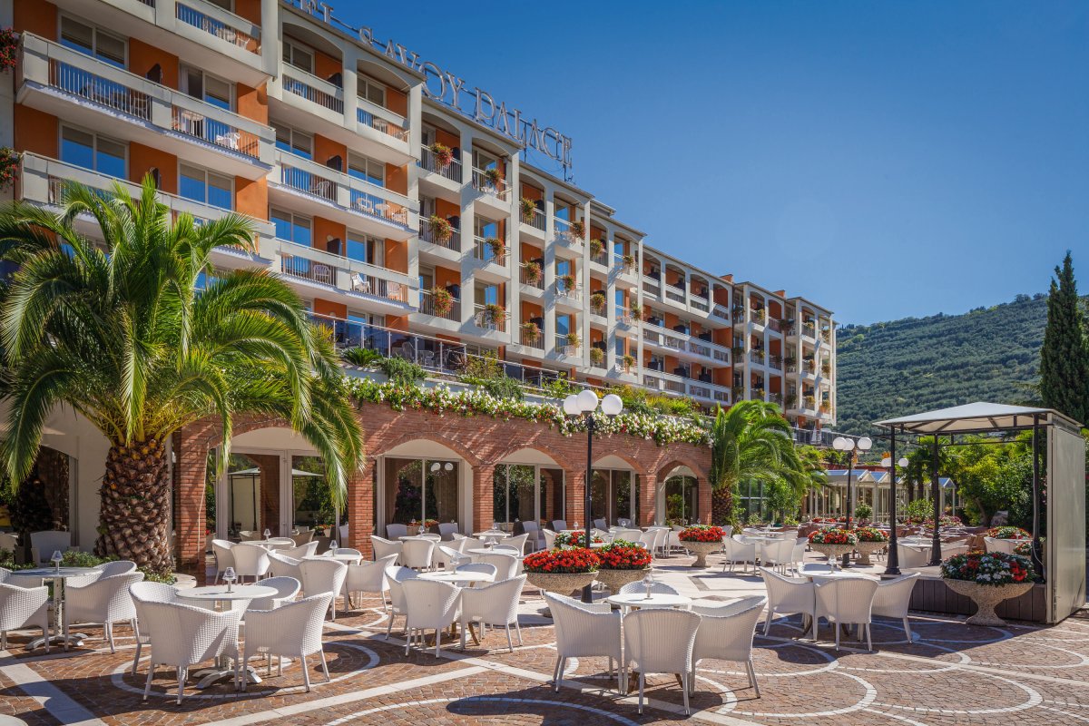 Der Gardasee ist der größte italienische See und zugleich einer der harmonischsten, und das, obwohl er unterschiedlichste Gesichter zeigt: Im Süden ist das Ufer flach und weit, im Westen fällt es steil ab. Im Osten erhebt sich das eindrucksvolle Gebirgsmassiv des Monte Baldo, während im Norden die Dolomiten den See vor den kalten Nordwinden schützen. Ihr Urlaubsort ist das hübsche Städtchen Riva del Garda. Die Strände, teils von Grün und teils von abfallenden Felsen umgeben, sind weitläufig und sonnig. Ringsum spiegelt eine mediterrane Vegetation aus Oliven, Zitronen, Palmen und Lorbeerbüschen den Wechsel der Jahreszeiten wieder. Das familiär geführte Hotel Savoy Palace befindet sich in ruhiger Lage, weit weg vom Verkehr und Lärm der Hauptstraße, nur 150 Meter vom See und 800 Meter vom Ortszentrum von Riva entfernt. Genießen Sie erholsame und unbeschwerte Urlaubstage.